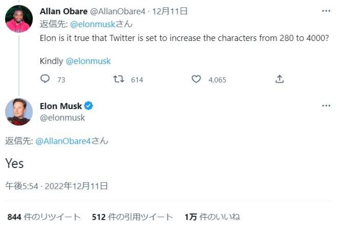 これはユーザーからの質問に回答する形でマスク氏が認めたもので、問い合わせたユーザーはマスク氏に「文字数が280から4000に増えるのは本当ですか?」と質問。この質問にマスク氏は「YES」の3文字で返答を行い、文字数制限の拡大は事実だとコメントしました。