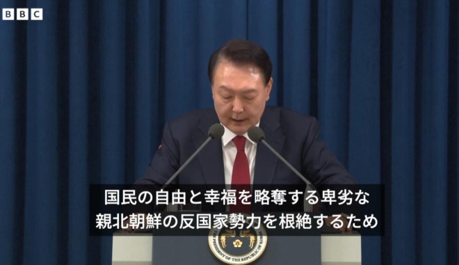 12月12日午前に韓国の尹錫悦(ユン・ソンニョル)大統領が非常戒厳令に関する談話を発表し、大統領の非常戒厳を宣言する権利の行使は正常な統治行為だとした上で、弾劾決議を連発している野党は国政を麻痺させているとして弾劾への対決姿勢を鮮明にしました。