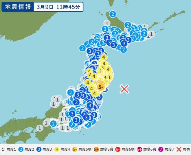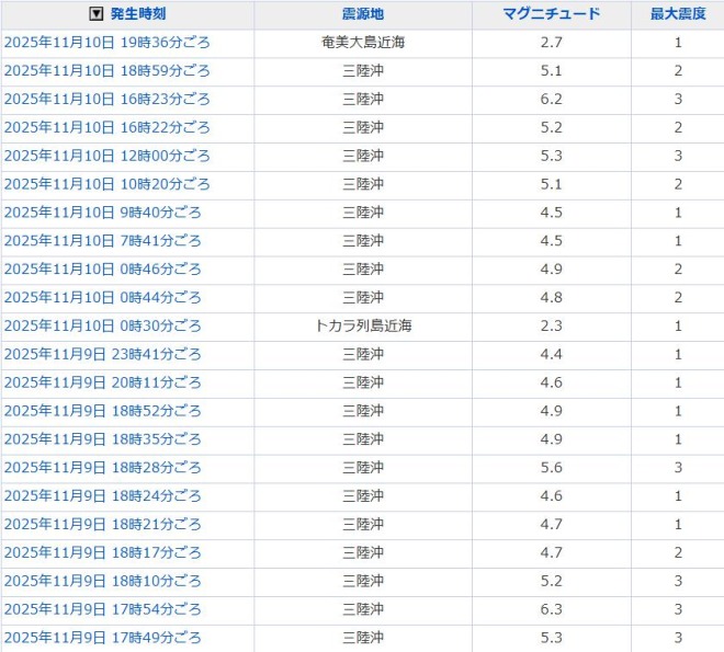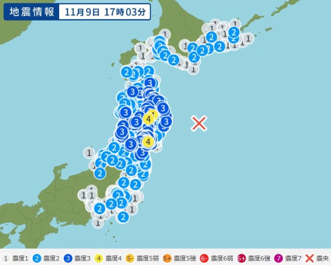 11月9日に東北地方の三陸沖でマグニチュード6.7の大きな地震が観測され、その後も多数の地震が発生中です。