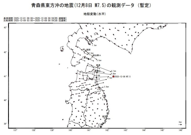 12月8日夜に青森県東方沖で発生したマグニチュード7.6の大地震で、大規模な地殻変動を観測したことが分かりました。