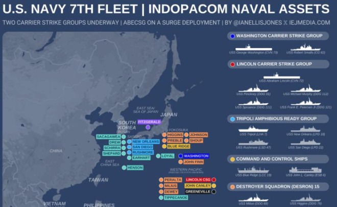 Confirmed today: The Abraham Lincoln Carrier Strike Group, currently sailing west in the Pacific on a surge deployment, chopped into U.S. 7th Fleet.