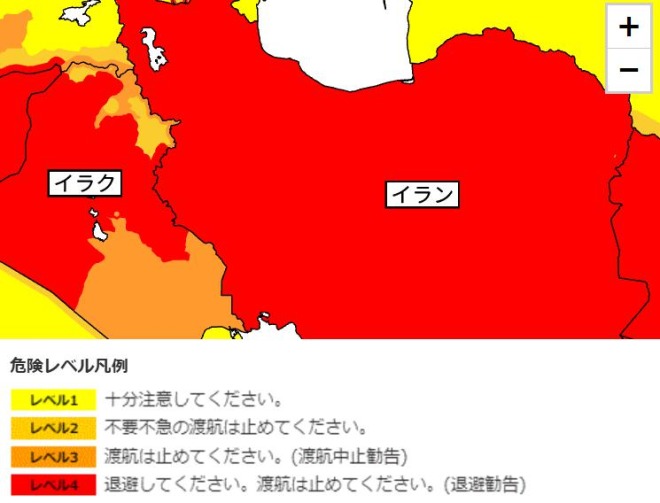 危険情報はこれまでレベル3(渡航中止勧告)から最も高いレベル4に変更となり、公式ホームページで外務省は「イランへの渡航はどのような目的であれ止めてください。既に滞在中の方は、自らの安全確保に努めつつ、安全に出国可能と判断される場合は速やかに国外に退避してください。やむを得ず滞在する場合には、複数の情報源から最新の情報を入手するなど特別な注意を払うとともに、十分な安全対策を講じてください」と注意を呼びかけています。