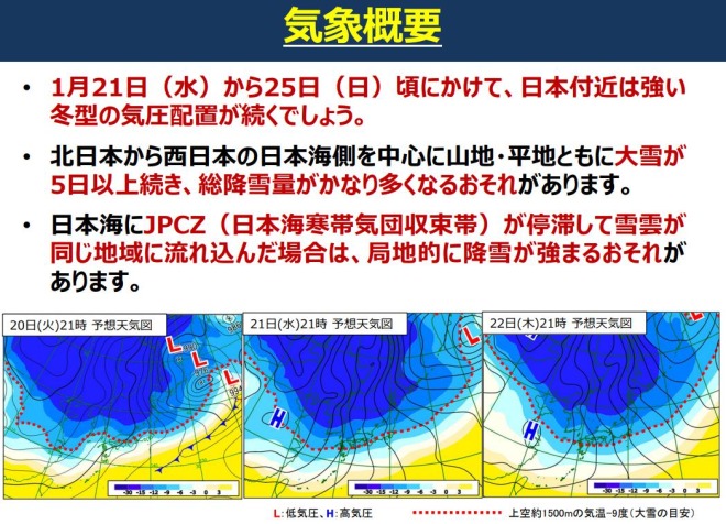 気象庁によると、1月21日から本格的に冬型の気圧配置が強まり、北陸地方や北日本、東北地方を中心にして大雪となる見通しです。