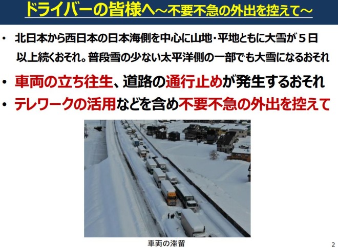 記者会見で国土交通省と気象庁は「山地、平地ともに大雪が5日以上続き、総降雪量がかなり多くなるおそれがある」「車両の立往生や道路の通行止めが発生するおそれがある。不要不急の外出は控えてほしい」と述べ、冬用タイヤの装着やチェーンの早めの装着、スコップといった冬用の装備を準備するように促していました。