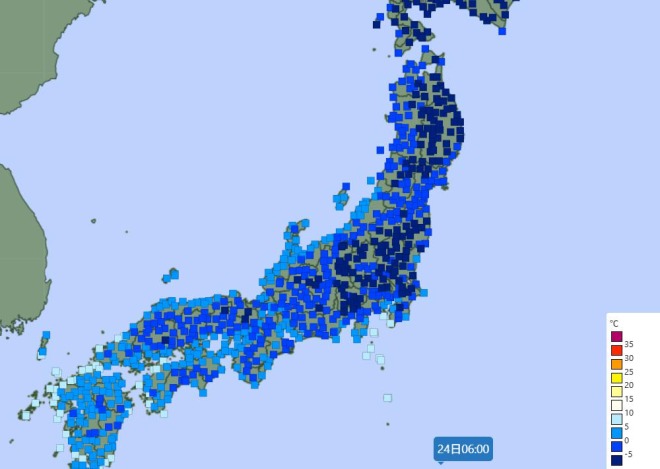 24日朝は強烈寒波の影響で、北海道の占冠と陸別で最低気温がマイナス28.1℃まで下がり、今シーズン全国で最も寒い朝となりました。