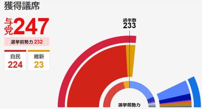 既に開票速報で自民党は単独過半数の233議席を確保しており、絶対安定多数(261議席)に達することも確実となっている情勢です。