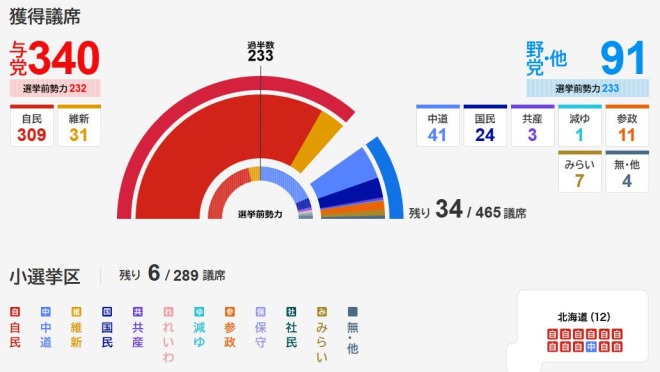 自民党は単独で310議席、与党として340議席以上を獲得することが確定的となり、これは結党時の64.0%を超える衆議院議席占有率となる見通しです。