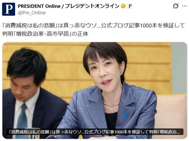 「消費減税は私の悲願」は真っ赤なウソ…公式ブログ記事1000本を検証して判明「増税政治家・高市早苗」の正体 https://t.co/K2MJzSG5LT