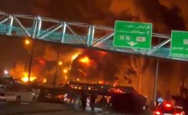 After the airstrike, oil spilled from the depot into the streets, entered the sewers and drainage systems, then caught fire, creating walls of flame on the highway of Tehran.
