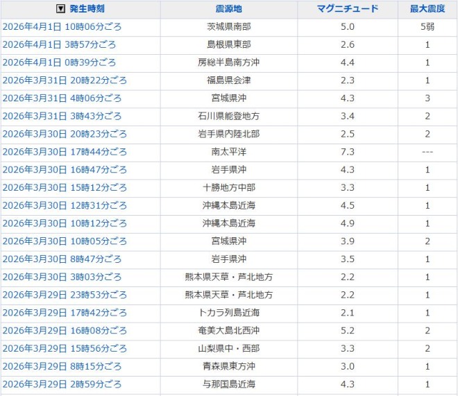 日本時間の2026年4月1日10時6分頃に茨城県南部でマグニチュード5.0の強い地震が発生し、首都圏に緊急地震速報が発表されました。