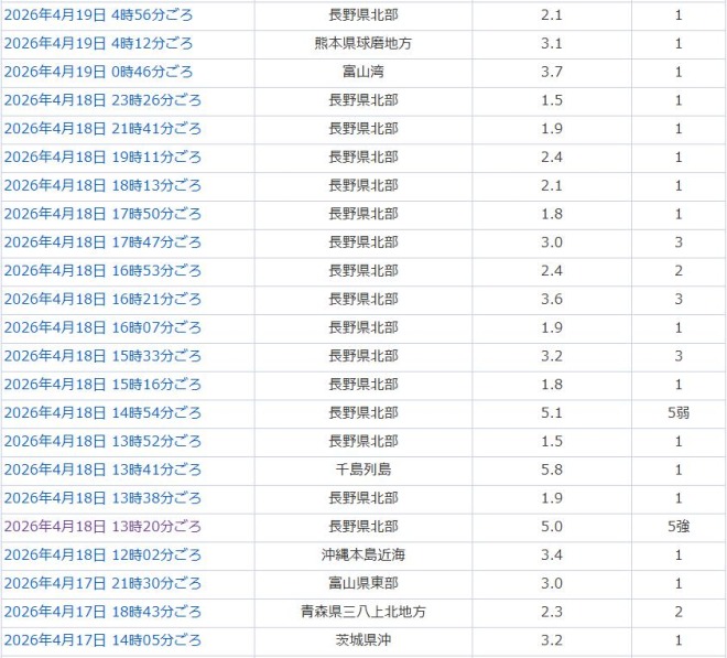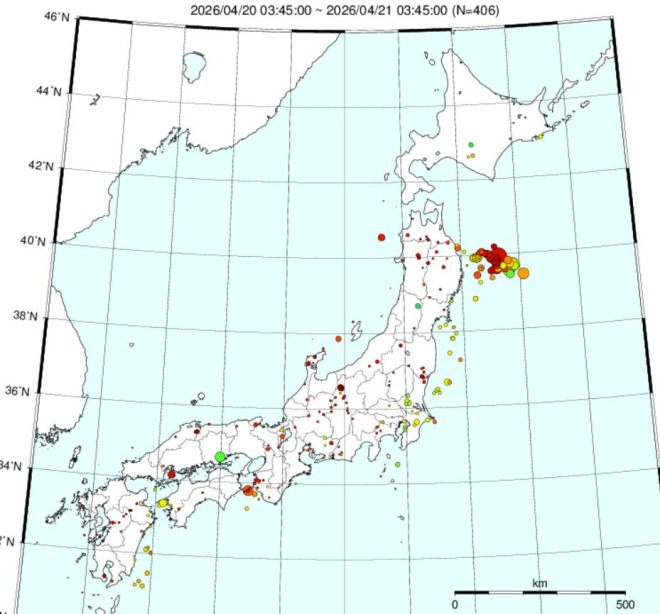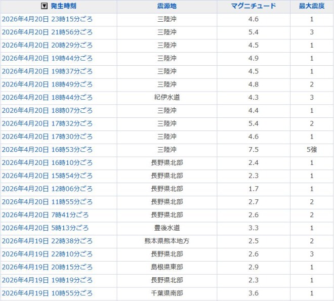 4月20日(月)の17時前に三陸沖を震源とするマグニチュード7.5の地震が発生しました。