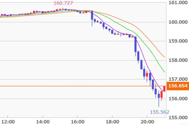 17時頃から連続でドル円が急激な円高方向に動き出し、そのまま1ドル=155円台まで円高が加速しました。
